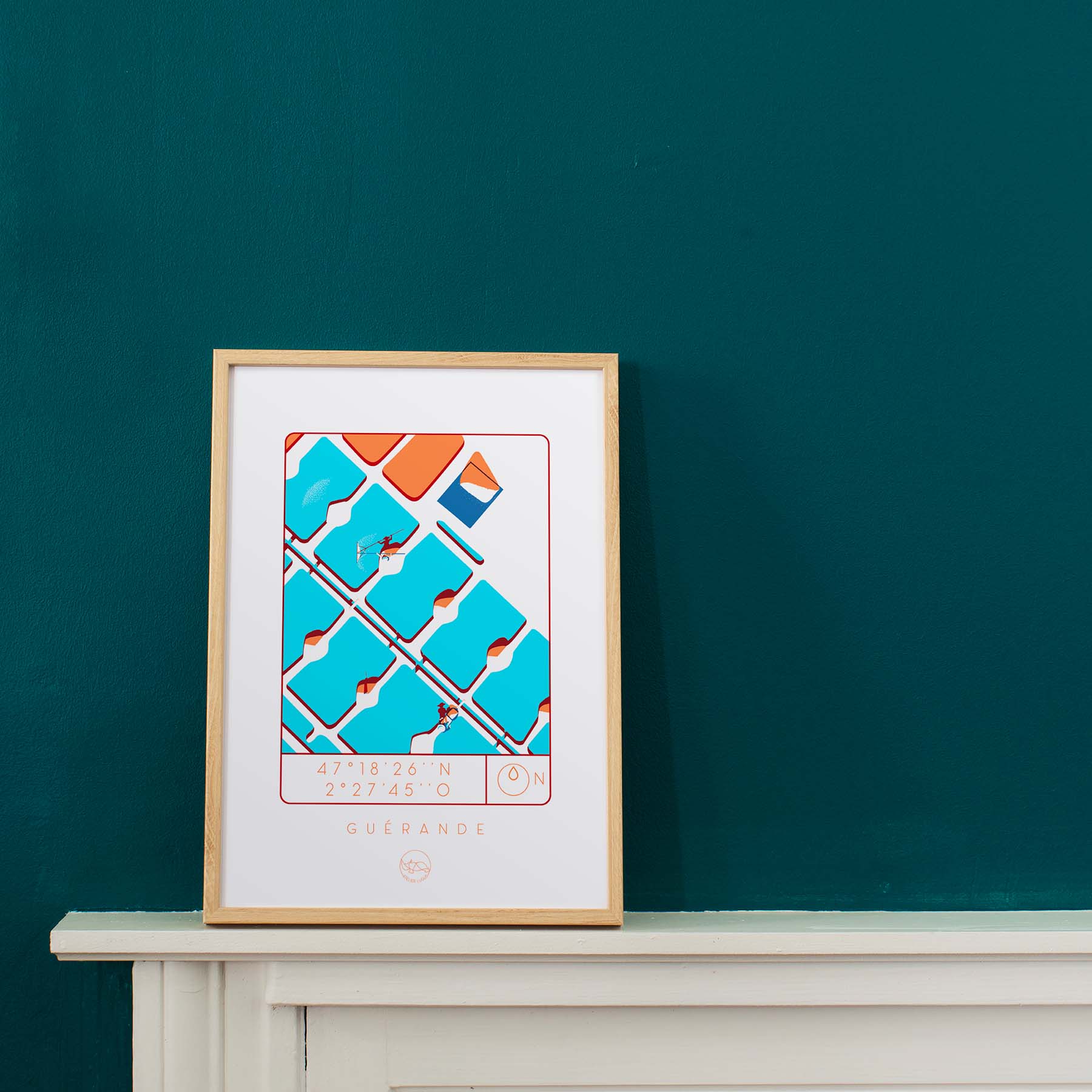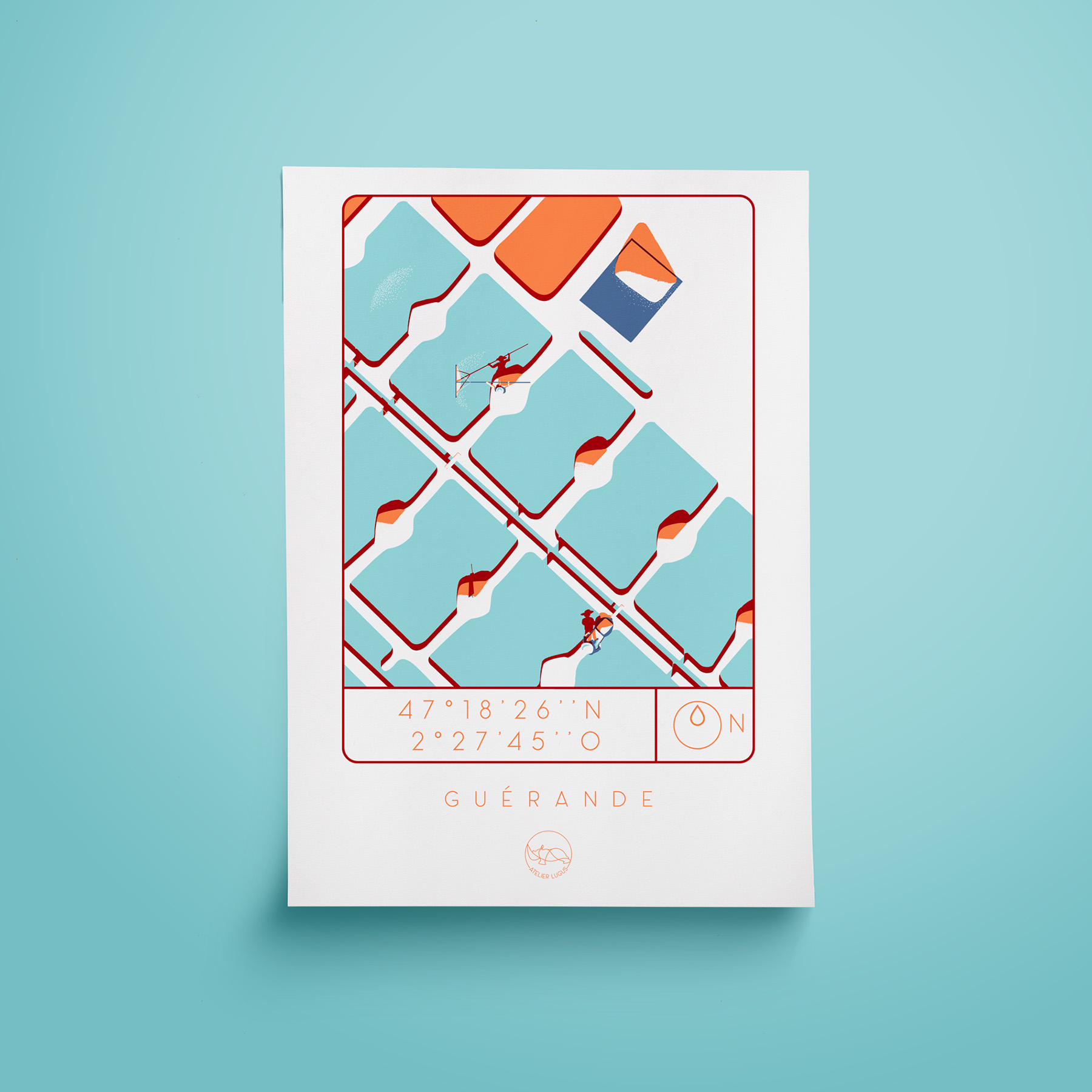 Cette sérigraphie, signée de l’artiste nantais Atelier Lugus, représente les marais salants de Guérande. Sous le visuel, vous pourrez retrouver les coordonnées GPS exactes du lieu concerné.